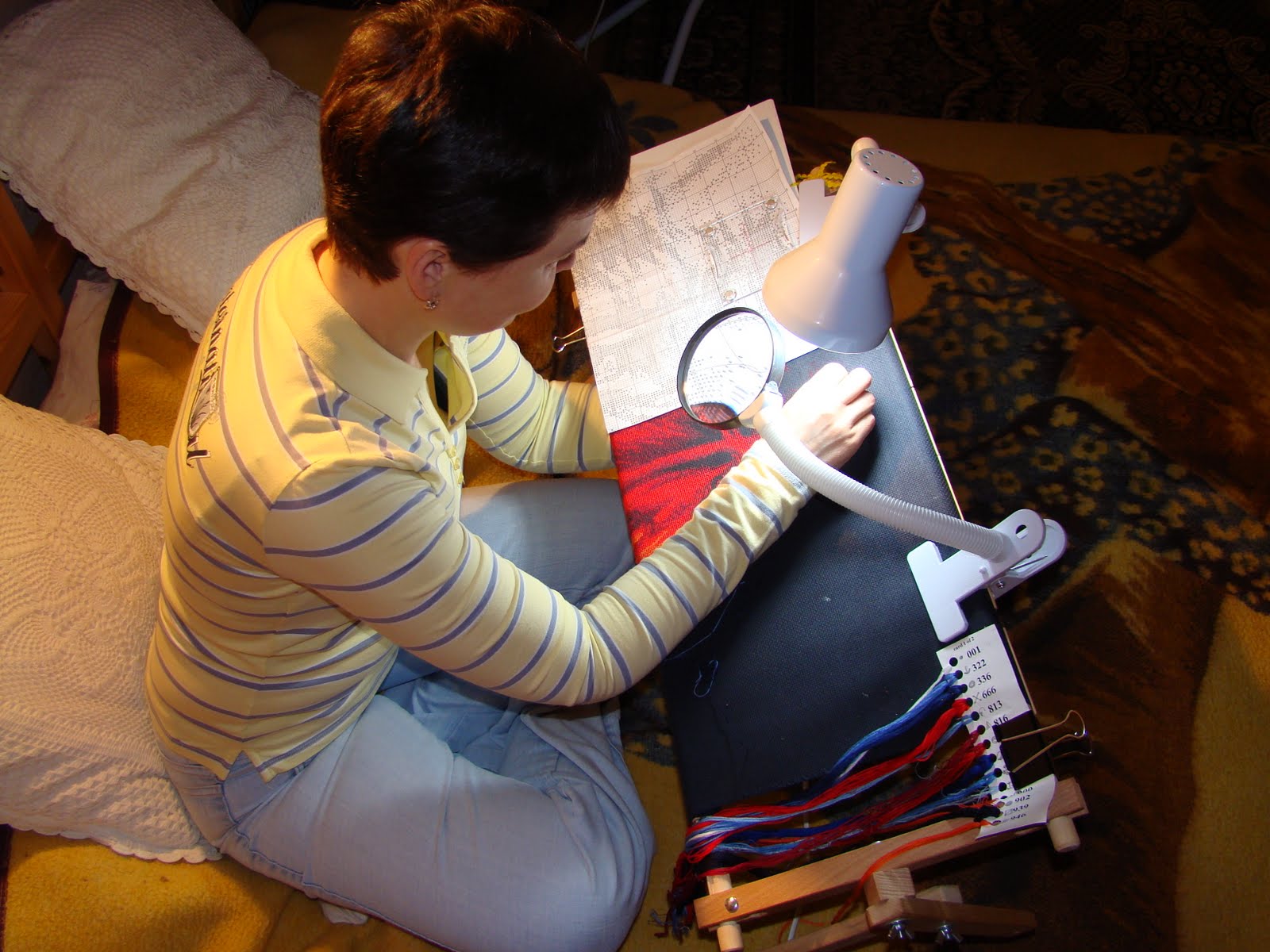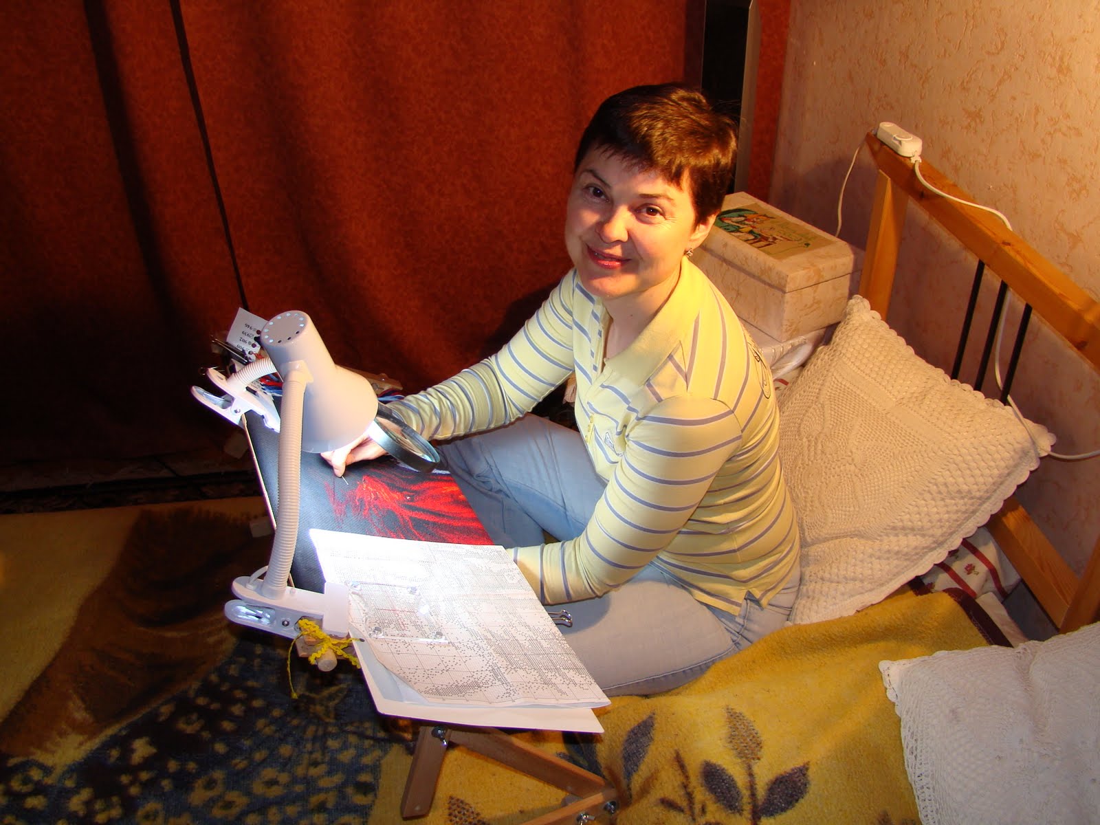 У меня есть станок для вышивания!А появился он так...Увидела я в интернете вышивку"Лед и пламя" от Dyan Allaire и "заболела".Это алая лошадь(или может быть скакун )на черном фоне.Кого то она мне напоминала!Я по гороскопу Огненная лошадь.Поехала на ВДНХ за одним,а купила ее.Размер готового изделия 36 на 50 см.Без станочка не обойтись. Заказала его в интернет магазине,привезли на следующий день.Металлический держатель для схемы с магнитом купила в Оби.Вещь просто необходимая.Находится перед глазами,экономит массу времени,место вышивки сразу видно.Но Аида №14 черного цвета-это нечто.Вечерами глаза очень уставали.Послушав мои стенания,муж купил две лампы- прищепки и лупу с ручкой.В одну лампу вставил эконом лампочку.У другой - открутил "голову". У лупы отпилил и обтачил ручку.Вставил в гибкий шланг "огрызок"лупы и посадил все на клей "Момент".Конструкция получилась удобная и "глазастая".Далее прикрутил на длинные болты к раме дополнительную перекладину,а на нее -лампу с лупой.Что бы рама не переворачивалась,между деревом и болтами положил резиновые прокладки.Глазам- сплошной кайф, душе- бесконечная радость!А муж заслужил пожизненный статус "лучшего в мире мужа".Быстро сказка сказывается,да не быстро дело делается.На обдумывание всего этого шедевра у него ушло месяца 1.5.Но зато каков результат!