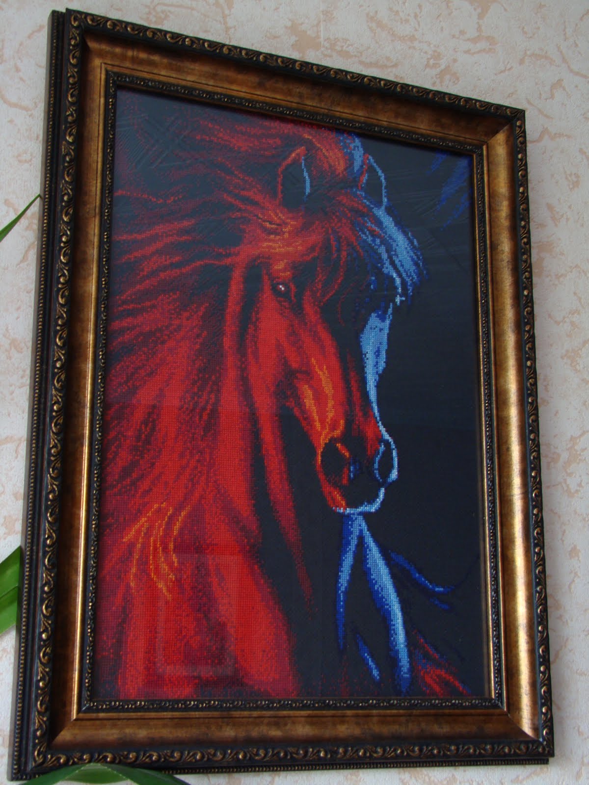 Наконец-то закончен полугодовой проект"Лед и пламя".Набор вышивки канадской фирмы Kustom Krafts,разработка схемы Dyan Allaire по мотивам произведений Sharlene Lindskog-Osorio. Увидела готовые работы в недрах инета и "заболела" этой вышевкой.По китайскому гороскопу я родилась в год Огненной Лошади.Где то прочла,что девочек,родившихся в год ОЛ(а он случается раз в 60 лет) сбрасывали со скалы.Якобы они приносили большие несчастья в китайскую семью.Какое счастье,что родилась я в России и в целивизованные времена!А мои родители меня очень любили.Почувствовалась мне в этой гордой свободолюбивой красавице родственная душа.Канва Аида-14 черного цвета.Размер работы в готовом виде 36х 50см.