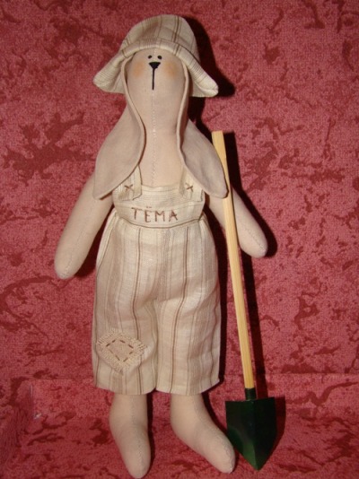 Заяц-тильда Тёма.Как только была готова тушка,сразу стало ясно,что это мальчик.Оставалось только сшить штанишки.Получился добрый и покладистый парень.Сразу решила сшить ему подружку.