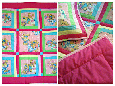 Одеялко простегала" в раскол".Навыки стёжки у меня практически нулевые.Прямая строчка вдоль шва "гуляла"то вкось,то вкривь.Шила,порола,ну кое-как справилась.Бек взяла в тон решётки и каймы-тёмно-розового цвета.Когда сложила сэндвич поняла,что ,наверное, он смотрелся бы веселее, будь светло-розовым в горошек.А так получилось простовато.