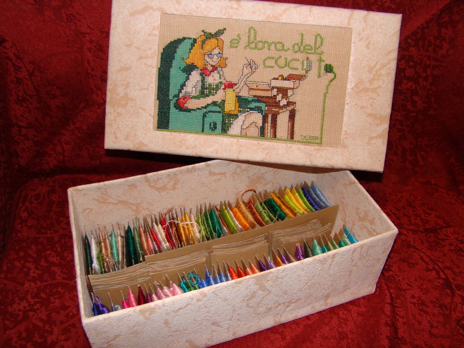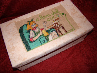 В журнале SUSANNA №3/2007 мне понравилась коробка,обтянутая тканью,с вышивкой на крышке.Но поскольку у меня нет швейной машинки, решила обклеить коробку из под обуви остатками обоев.В вырезанное окошечко вставила вышивку и покрыла её акриловым лаком.Где-то прочла,что можно так сделать.Ни чего о двустороннем скотче я тогда не слышала.Сейчас я,конечно,всё сделала бы не так.Буду учиться на своих ошибках.