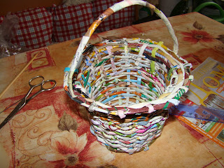 В процессе работы решила отказаться от ручки и сплела крышечку.Серединка получилась уже поровнее.Корзиночка,конечно,кривовата.Но удовольствие доставила неимоверное.Теперь тащу в дом всякую макулатуру:рекламные журналы,газеты и прочую бумажную продукцию.В планах газетница с крышкой,как у Nila.