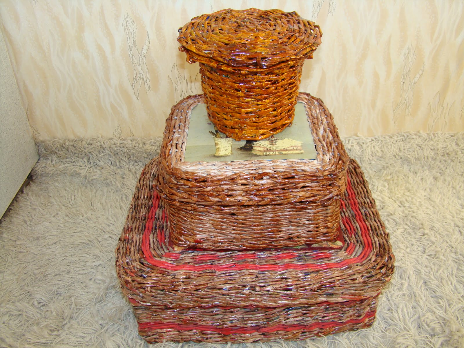 Способ плетения-прежний,но изменила крепление крышки.У самой коробки и у крышки сделала небольшие бортики, на которые и ложится крышка.Красила уже готовую морилкой цвета"Дуб".В конце всё покрыла одним слоем акрилового лака.