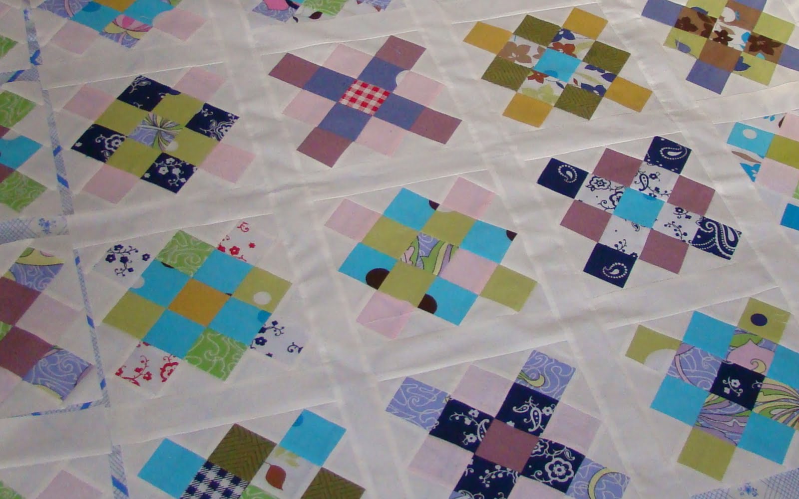 Между делом:утром до работы и вечером после таковой(благо до неё 10 минут неспешным шагом) собрала 20 блоков "Бабулиных лоскутков".Для утилизации остатков тканек- незаменимый способ шитья.Разложила на полу,полюбовалась,получила от мужа порцию хвалебных песен(надеюсь, искренних!)и побежала сшивать всю эту неземную красоту в единое целое.
